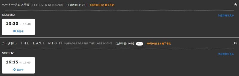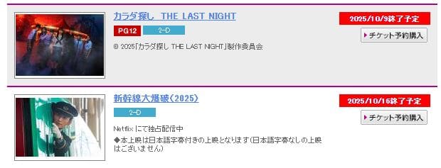 - 各作品名の右側に黄色の文字で「終了予定日」が出たら、その劇場の終映が近いサインです
